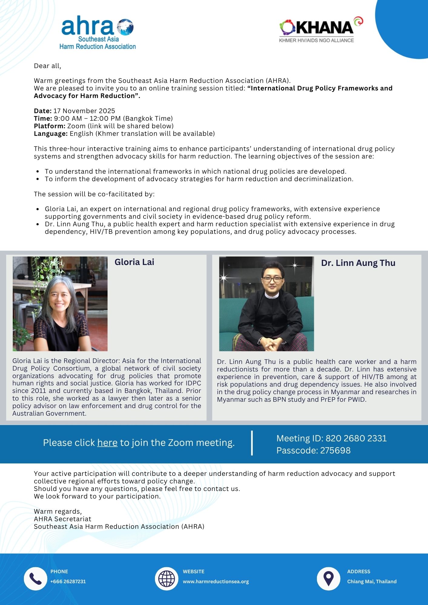 We are excited to invite participants to join our upcoming training to understanding of drug use and harm reduction, and explore pathways from dependency to effective policy advocacy.
