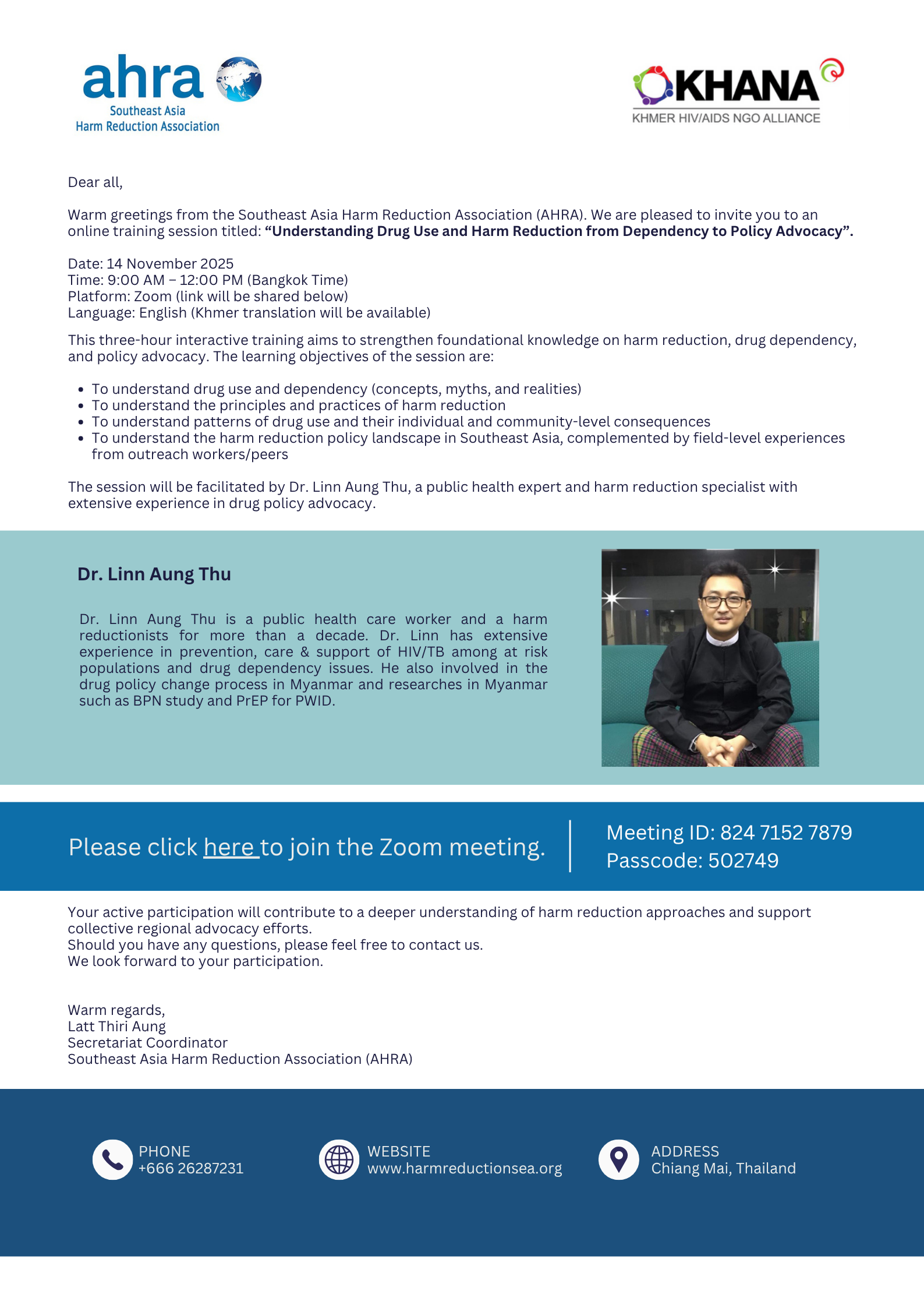 At the Southeast Asia Harm Reduction Association (AHRA), we are excited to support the region’s voices and ideas. If you need guidance or help crafting your abstract, we’re here to assist! Together, let’s elevate the harm reduction movement and ensure that Southeast Asia is well-represented at this international platform.